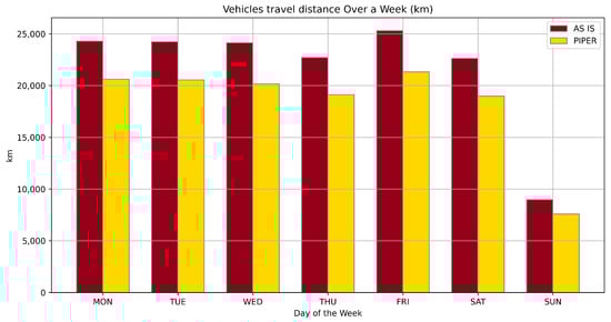 Comparison of the total distance traveled (km) over a week for the AS IS and PIPER solutions.