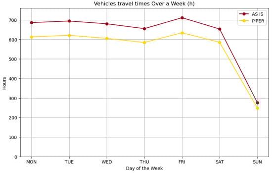 By comparing the AS IS solution with the model solution, we observe a substantial reduction in the total distance traveled and transit time. Specifically, the PIPER solution decreases the total distance traveled by 21,057 km, which translates to a 13.83% improvement. On average, the PIPER solution allows for daily savings of 3008 km, as illustrated in Figure 2. The savings are relatively consistent during weekdays, reflecting the robustness of the optimization approach under typical operational conditions. However, the impact of optimization is less pronounced for Sunday services. This is due to the reduced number of services performed on Sundays, which results in stricter margins for optimization.