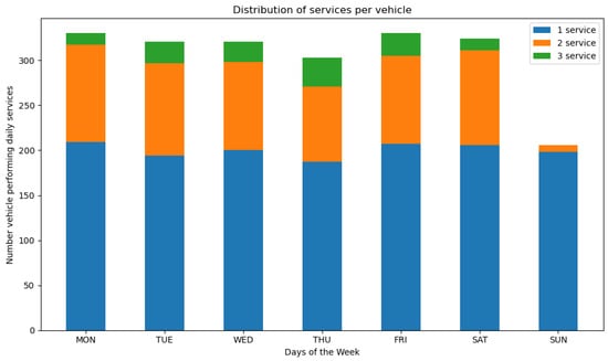 The stacked bar plot in Figure 4 illustrates the distribution of services allocated per vehicle across different days of the week in the PIPER solutions. Each bar represents the number of vehicles assigned to one, two, and three services per day. Note that, on weekdays, despite the model penalizing such decisions in the objective function, some vehicles are utilized across all three shifts. This allocation is influenced by the specific vehicle requirements for a subset of services and the constraints imposed by the total available fleet of vehicles.