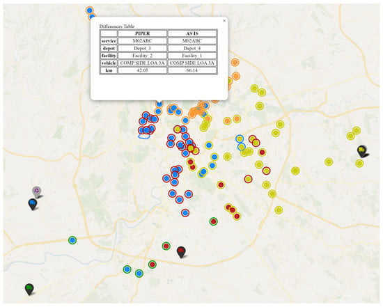 Beyond executing the model on the given instances, we developed an offline prototype to inspect the solution visually. This tool allows the project team to compare the proposed solution with the daily AS IS solution for validation and to gain insights into the process through simulated scenarios. Figure 5 shows a screenshot of the visual tool, illustrating its functionality for inspecting and comparing PIPER and AS IS solutions when considering a single service. The inspection can also be conducted on transshipment locations and plants through performance indicators.