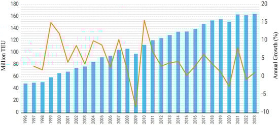 The global supply chain has become increasingly reliant on maritime transport due to the expansion of the world economy and the rapid increase in international trade. Despite the COVID-19 pandemic’s effects, which reduced global trade, the world economy began to recover in 2021 mainly because consumer spending grew due to the relaxation of pandemic-related restrictions [1]. The global containerized trade rebounded and reached a mark of close to 165 million TEU in 2021 [2]. It declined slightly by −0.7% in 2022 and was forecasted to grow to 1.2% in 2023, as shown in Figure 1 below.
