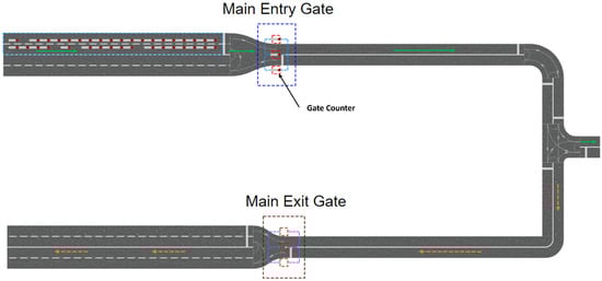 This paper presents a conventional CT with a hypothetical rectangular layout configuration measuring 2500 × 750 pixels, whereby 100 pixels represent 100 m in length. The abstracted operations are limited to the processes at the gate and the yard area. The CT layout comprises single unit entry and exit gates, eight YBs, eight overhead YCs, and a complete road network, as shown in Figure 3 and Figure 4 below. Each gate unit comprises gate counters that the ETs use to gain access to and from the yard area upon arrival at the CT and departure from the CT. Inside the CT lies eight YBs, five of which are used to store the inbound containers and three for storing the outbound type. One YC serves each YB at any given point in time. The cranes are assumed to be of the overhead type and are set to operate within the host YB during the simulation period.