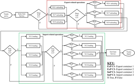 The order of the activities in the blocks determines the entity’s movement within the model. Before entering the planned YB queue for crane service, the entity (truck) checks against a predetermined condition and goes through the target process if the condition is met. Otherwise, it moves on to the next block until it finds a matching condition, or it leaves the yard area and travels to the exit gate after completing the prescribed operations.