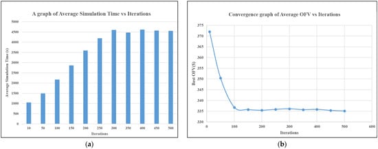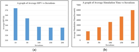 (a) Graph of average simulation time vs. iterations, (b) graph of average best OFV vs. iterations.