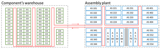 The total distance of the milkrun routes in the assembly plant is 960 m, the total time of travelling is 17.6 min, while the required time for materials handling is 16 min. The total distance of the milkrun routes in the component’s warehouse is 668 m, the total time of travelling is 10.02 min, while the required time for materials handling is 12.5 min (Figure 11). As Figure 11 shows, in this hub-based scenario the routes in the assembly plant and in the component’s warehouse are not sequenced, because they are not performed by the same milkrun. In the case of the conventional milkrun, the collection and distribution routes are sequenced and they are performed by the same milkrun (integrated collection and distribution milkrun), while in the case of the hub-based milkrun supply the collection milkrun routes are optimized, which means that it is possible to reduce the required time to perform collection routes in the component’s warehouse. Within the frame of Section 3.3, the computational results of the conventional and hub-based milkrun supply are compared to show the advantages of hub-based milkrun supply.