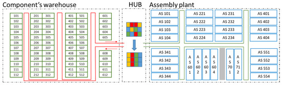 In the case of hub-based milkrun supply (Figure 2), the collection routes in the component’s warehouse and the distribution routes in the assembly plant are connected by a hub, which is responsible for the sequencing of collected components according to the demands of assembly cells. In this case, the optimization of collection and distribution processes are independent, therefore it is possible that potential reductions in transportation distances, transportation time, energy consumption, and emission can be achieved. In Figure 2, the red lines represent the collection route of components in the component’s warehouse, while the green lines are for the distribution milkrun routes in the assembly plant. In the hub, the collected components are sequenced depending on the demands of the assembly station to optimize the distribution milkrun routes.