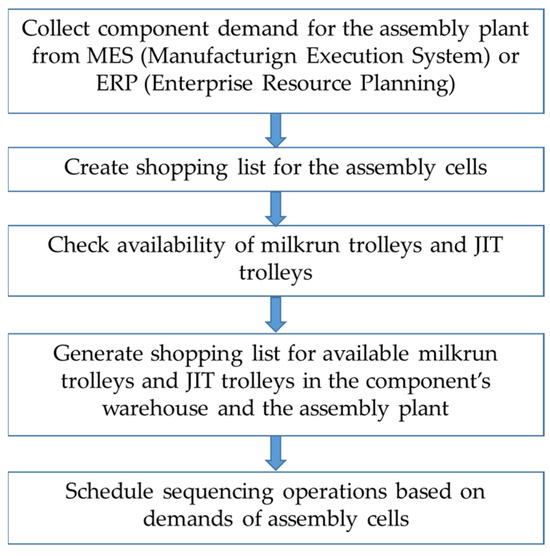 The hub-based process can be described as follows. The process begins by collecting component demand data from the Manufacturing Execution System (MES) or Enterprise Resource Planning (ERP) system, which detail the required materials for the assembly plant. Based on this demand, a shopping list is created for each assembly cell, specifying the components needed. Next, the availability of milkrun trolleys and just-in-time (JIT) trolleys is checked to ensure the necessary transport resources are on hand. Using the available trolleys, a shopping list is generated, consolidating the required components from both the component warehouse and the assembly plant. This list ensures that materials are allocated efficiently across the available trolleys. Finally, sequencing operations are scheduled, aligning the material delivery schedule with the demands of each assembly cell to optimize the assembly process and maintain continuous production flow. The process is shown in Figure 3.