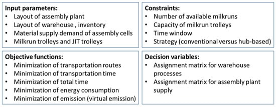 The importance of logistics service providers and 4th party logistics providers is highlighted by De Souza et al. [12]. They explore the Fourth Party Milkrun (4PMR) model as a flexible contract mechanism for horizontal collaboration to reduce last-mile logistics costs. Case studies and scenarios demonstrate significant cost reductions using the 4PMR model. Different research approaches show that the design and operation of milkrun-based in-plant supply and milkrun-based supply chain operations can be based on a wide range of objectives, objective functions and constraints, including transportation distance optimization [13], capacity utilization and loading model optimization [14], vehicle routing [15], surface occupation and utilization of available area for production and logistics operations [16], improvement in cost efficiency [17] and return on investment calculation for automatized milkrun solutions, scheduling of milkrun routes including time table design for transportation and materials handling (loading and unloading) operations [18], and fleet size optimization [19].
