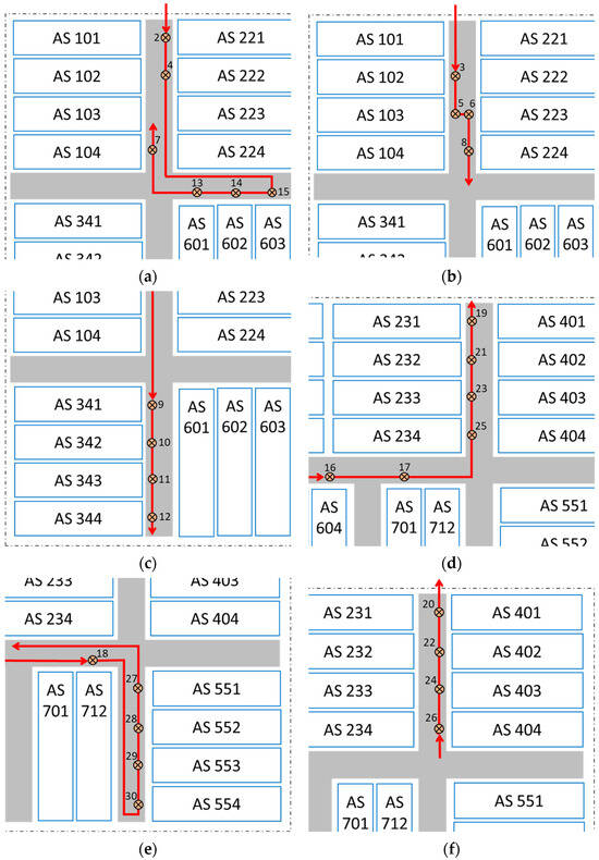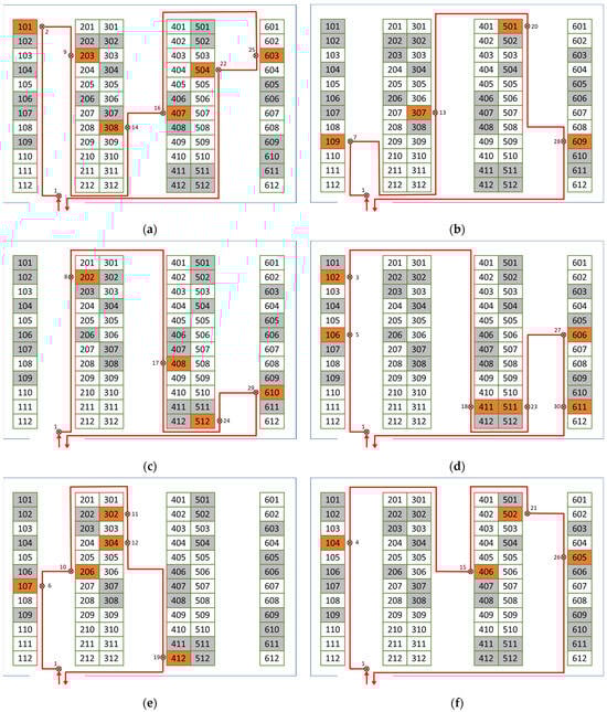 The optimized milkrun routes within the analyzed time frame in the component’s warehouse in the case of conventional milkrun supply: (a) Route 1 with milkrun trolley utilization of ; (b) Route 2 with milkrun trolley utilization of ; (c) Route 3 with milkrun trolley utilization of ; (d) Route 4 with milkrun trolley utilization of ; (e) Route 5 with milkrun trolley utilization of ; (f) Route 6 with milkrun trolley utilization of .