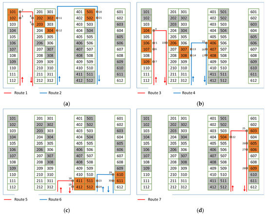 The optimized milkrun routes within the analyzed time frame in the component’s warehouse in the case of hub-based milkrun supply: (a) Route 1 and Route 2 with milkrun trolley utilization of and ; (b) Route 3 and Route 4 with milkrun trolley utilization of and ; (c) Route 5 and routes 6 and 3 with milkrun trolley utilization of and ; (d) Route 7 with milkrun trolley utilization of .