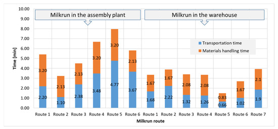 The total distance of the milkrun routes in the assembly plant is 960 m, the total time of travelling is 17.6 min, while the required time for materials handling is 16 min. The total distance of the milkrun routes in the component’s warehouse is 1220 m, the total time of travelling is 18.3 min, while the required time for materials handling is 12.5 min (Figure 9).
