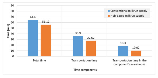 As the computational results in Section 3.1 and Section 3.2 show, it is possible to decrease the required time of in-plant milkrun supply of assembly cells using the hub-based milkrun supply approach. Figure 12 summarizes the main advantages of hub-based milkrun supply focusing on time-related parameters. In the case of the analyzed scenarios, the hub-based milkrun supply resulted in 12.85% savings in the total transportation and materials handling (loading and unloading) time. However, the hub-based milkrun supply has no impact on the materials handling time, because the same loading and unloading operations must be performed by the operators (milkrun drivers), but the transportation time is significantly influenced. The hub-based solution led to 23.06% savings in transportation time, including transportation in both the component’s warehouse and the assembly plant. The most significant result is that the hub-based solution resulted in 45.25% savings in the transportation time in the component’s warehouse. The mechanism of the milkrun supply led to these results, because of the following: