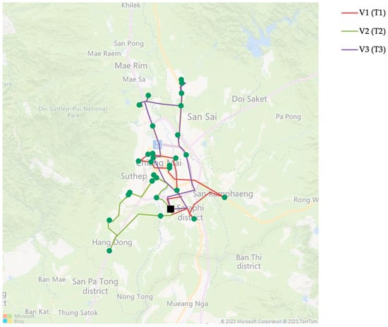 To address these issues, a Vehicle Routing Problem (VRP) optimizer was implemented. The problem was classified as a Capacitated Time-Window Vehicle Routing Problem []. A VRP Spreadsheet Solver was employed to develop the solution []. After collecting customer location data and requirements, a distance matrix was constructed, enabling the design of more efficient routes (as illustrated in Figure 2).