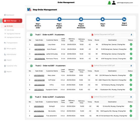 To address these inefficiencies, a Transportation Management System (TMS) was developed and implemented. The TMS design process included system analysis, logical design, and physical design (as illustrated in Figure 3). The system incorporates various functions, including sales order management, pick–pack–ship job assignment, fleet and personnel management, stock cutting, GPS-based delivery tracking, return management, and monitoring and reporting.