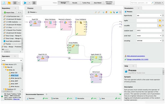 Basic forecasting models were initially introduced [], but accuracy was unsatisfactory with Root Mean Square Error (RMSE) values under 60%. Subsequently, advanced forecasting tools using data mining techniques (RapidMiner and Python) were implemented (see Figure 5). Using two years of historical sales data as a training set, the new model achieved 80% accuracy (RMSE).