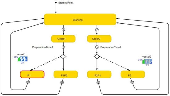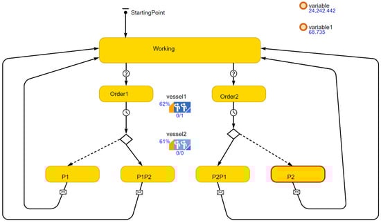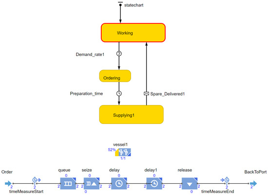 The baseline scenario is named Scenario 1 and totally depends on separate vessel shipments with no sharing. The simulation model that represents the shipment process is shown in Figure 1. The state chart represents the asset agent (platform), where it has several states; it should usually be in the working state unless a need for goods is triggered or a spare part is demanded (demand rate transition in the figure). Once a shipment is demanded, the goods go to the “ordering” state and a shipment should be ordered. The shipment preparation time is set at 4 h and then the goods will move to the “supplying” state where the vessel will be moved to Platform 1 to deliver the goods. When the vessel has reached the platform and the goods are delivered, the agent will go back to the “Working” state and wait for the next shipping order. The vessel agent is modelled as a discrete event process, as shown in the bottom of Figure 1 that starts with “order” and ends up delivering the goods and moving back to the port “BackToPort” waiting for the next order. The average supply lead time is a triangular distribution (Min 8 h, Mean 10 h, Max 20 h). The model elements are further explained in Table 1.