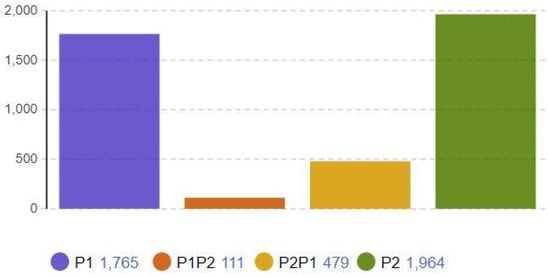 Based on Table 4, the number of journeys (deliveries) for Vessels 1 and 2 has clearly reduced using the shared logistics concept (Scenarios 2 and 3) compared to the separate logistics (Scenario 1). It dropped from 3309 to 1878 journeys for Vessel 1 and from 3361 to 2443 journeys for Vessel 2, as shown in Figure 7. The shared journeys are around 590 journeys (111 for P1P2 + 479 for P2P2), as shown in Figure 8.