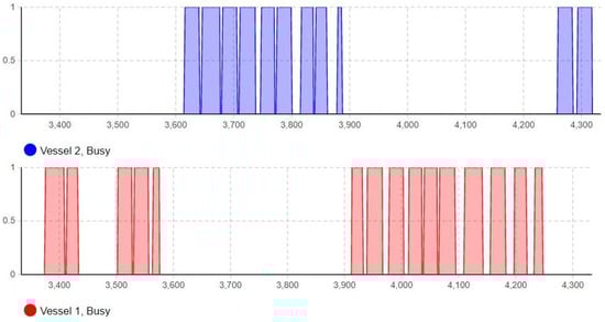 Utilization time-plots for Vessels 1 and 2 under scheduled shared logistics scenario.