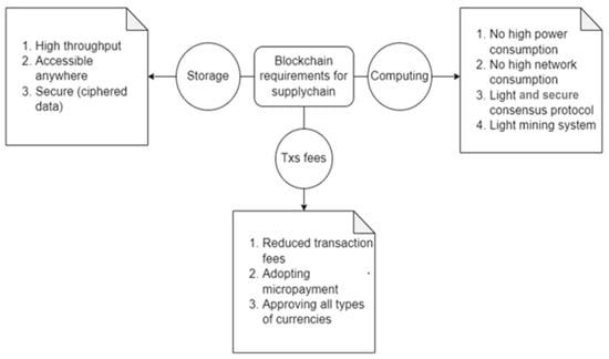 An effective blockchain requires an ideal network infrastructure, where all nodes involved in each blockchain must be connected and synchronized continuously so that the system can run and the blockchain can function as intended. In general, IoT devices are dispersed across several geographic locations. Providing good throughput requires expensive hardware that is susceptible to hacks and attacks. A lack of hardware security increases the likelihood of hacks and security flaws. Similarly, blockchain fees still pose a substantial challenge in blockchain. Data should also be stored long-term in an extendable form in the cloud to give devices secure access to data with a high throughput. In regard to blockchain fees, the recommended fees for the supply chain should be low. The fees can be made affordable for people of different economic strata and for different currencies. Additionally, we should consider how we could function without the need to connect or how smartphones use peripheral devices that allow payments to be made offline and appear in the blockchain once online. Handling storage, computing, and transaction fees is a tricky task that involves building around the needs and capabilities of each use case of each system. Thus, the previously mentioned terms must be managed in such a way that they do not negatively influence the function of the supply chain. In conclusion, an ideal solution with Internet of Things (IoT) technology should have all the capabilities of the blockchain (e.g., data storage and computational resources) without being involved. At present, new supply chain blockchain solutions have not yet achieved this goal. Most proposed blockchain systems to date do not include the needed features.