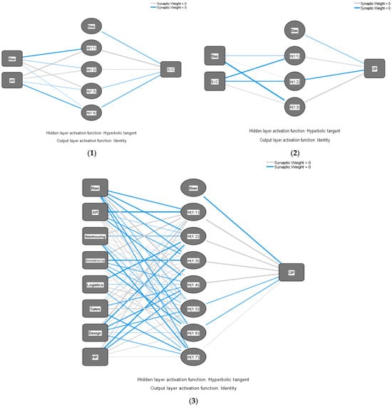 This study used the ANN model because it estimates accurately, making it preferable to PLS-SEM and regression modelling. ANN tools excel at modelling complicated connections with variable non-linear response values, leading to better predictions than traditional methods [78]. According to Lie’bana-Cabanillas et al. [79], ANN modelling finds latent non-linear practical ties in statistics and lets the modelling tool utilize the correlations on a new set of data. The ANN analysis was carried out operating SPSS. In the ANN analysis, only the relevant predictors derived from the PLS-SEM results were utilized. The ANN analysis considered the latent variables, as depicted in Figure 2 (network diagrams 1–3). Diagram 1 comprises one input neurone (AR) and one output neurone (SVC). Diagram 2 comprises one input neurone (SVC) and one output neurone (OP). Diagram 3 comprises two input neurones (AR and SVC “6 constructs”) and one output neurone (OP). The results indicated that the predictive capability of the ANN analysis (R2 = 83%) significantly surpassed that of PLS-SEM (R2 = 68.2%). The results indicated that the ANN technique more effectively elucidated endogenous constructs compared to the PLS-SEM approach.