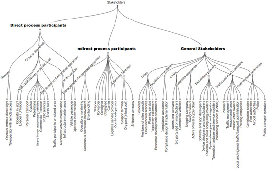 To achieve this goal, 28 in-depth interviews were conducted and qualitatively analyzed, adopting a ’thematic’ approach. Participants were recruited among the partners of the European Project AWARD (https://award-h2020.eu/, accessed on 30 October 2024). The project’s goal is to enable connected and automated heavy-duty vehicles to operate, autonomously and remotely controlled, in real-life logistics operations and under all weather conditions. Project solutions include a tailored FMS developed precisely for the project and four different logistics vehicles (a port tug, a tow truck, a mid-sized swap body truck, and a forklift). These vehicles feature three operation modalities: manually driven, remotely operated, and autonomous. Although the vehicles are based on different platforms and are meant to carry out different tasks according to the logistics needs of each hub, they are all endowed with similar technical equipment (i.e., sensors, lidar, cameras, etc.). These technological solutions were selected for and tested in four different logistics pilot sites across Europe. Respectively, these were the port of Rotterdam, the Oslo airport, the premises of a hub and a factory (i.e., hub-to-hub) in Gunskirchen, Austria, and a research facility with ad hoc reproductions of open-world loading environments in Seibersdorf, Austria. Collecting observations related to these different logistics contexts and geographical locations was one of the main recruitment criteria, together with a balanced representation of different categories of stakeholders. The logistics stakeholder taxonomy developed by [19], shown in Figure 1, provides the reference framework for the stakeholder categories, as it offers a comprehensive overview of the actors directly and indirectly involved in logistics operations and automation processes, as well as several others with economic or social interests.