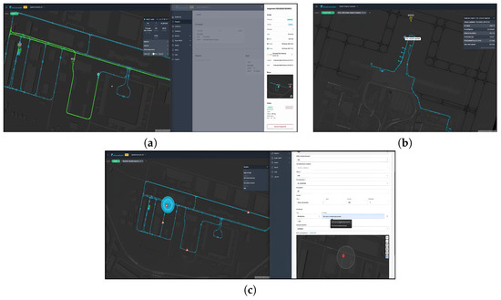 At the beginning of the virtual interview, participants were greeted and thanked, informed that their answers were being recorded, and briefed about the structure and purpose of the study. Then, they were asked to picture themselves as a logistics operator in charge of a fleet of three AVs. In this role, their tasks included the scheduling of loading, transporting, and unloading operations as well as resolving issues. They were then shown three videos portraying logistics operations scenarios, similar to those tested in the pilot studies. The videos were played from the point of view of an FMS developed in the AWARD project as a tool to both monitor and (if needed) remotely control the vehicles. Each logistics operation shown in the videos took place in one of the project use case hubs, as seen from the FMS view (see, respectively, Figure 2a, Figure 2b, and Figure 2c). After each video, participants were asked a question concerning functionalities and features of the FMS. Specifically, the questions concerned what aspects of the FMS could be improved or changed regarding, respectively, tasks planning, weather information, and issue resolving.