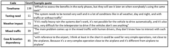 Generally, airport participants referred to AVs more than to other technologies. One recurrent topic among the airport interviewees was the impact of harsh weather on the vehicles’ capability to operate efficiently. In turn, this calls for safe, manual backup solutions, as airports experience huge volumes of traffic and operations cannot be delayed. Consequently, while airport stakeholders saw efficiency and safety as the main potential benefits of automated logistics operations, they also expressed doubts concerning the current levels of technological readiness (i.e., vehicles stopping for minor inconveniences, issues deriving from proximity to planes) with regard to the airport’s high-pace operations. Hence, human supervision and, occasionally, intervention was seen as a crucial requirement, at least for the near future.