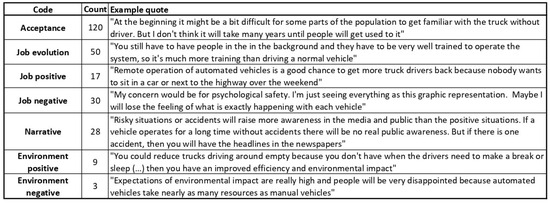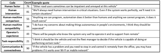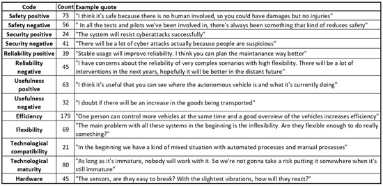 This category, which does not strictly reflect the structure of the survey, summarizes the important and multi-faceted topic of human interaction with the technologies involved in the automation of logistics operations. The codes grouped into his category, their frequency, and example quotes are presented in Figure 6.