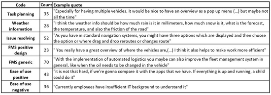 This category concerns every technological aspect and quality (or lack thereof) playing a role in determining users’ acceptance, with the exception of topics specifically related to the FMS (see the next subsection). The most important sub-categories that contribute to this theme are illustrated below. Figure 4 shows the pertinent list of codes with frequency and example quotes.
