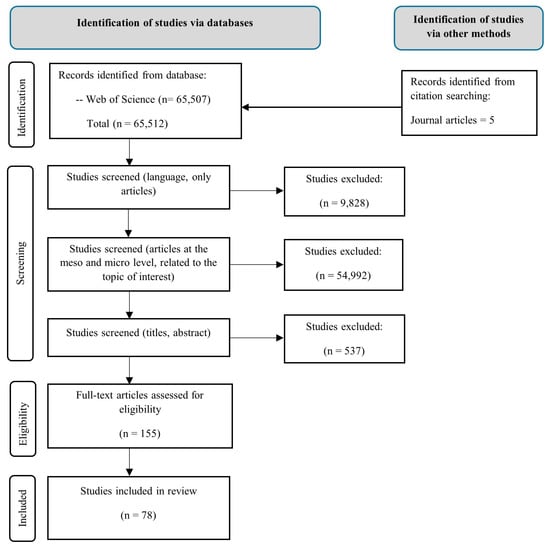 To ensure the eligibility of each included article within the review, the selected studies underwent a rigorous, multi-stage exclusion process, each stage applying specific criteria. In the first two rounds of exclusion, we filtered studies to include only articles published in peer-reviewed, English-language journals, ensuring a high standard of quality and accessibility. Additionally, these studies should have a clear focus on logistics within mountainous regions, specifically addressing logistics challenges, sustainable practices, or infrastructure. Studies focused on broader logistics topics without regional or thematic relevance were excluded. Figure 1 illustrates the process in detail. In the third round of exclusion, we retrieved an initial dataset of 692 articles. These were then filtered by titles and abstracts to exclude studies with a different focus, even if relevant keywords were present in their topics. This stage ensured alignment with the core themes of mountain logistics, reducing the dataset to 155 eligible articles for full-text assessment. Finally, through a thorough review of the full texts of these 155 articles, we narrowed down the focus to 78 articles that met all inclusion criteria and provided the most direct contributions to the understanding of logistics in mountainous areas. This comprehensive screening process ensured that the final set of studies included only the most relevant and high-quality articles for our systematic review.
