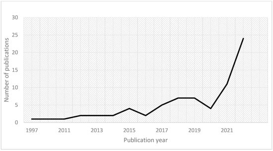 While our search was not restricted by publication years, the distribution of published papers spans from 1997 to 2023. This temporal range aligns harmoniously with the heightened emphasis on the sustainable development of mountain regions [,]. Figure 2 portrays an apparent upward trajectory in published papers throughout the period.