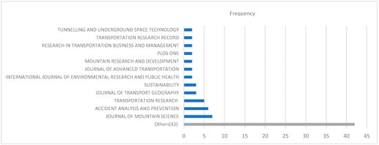 Figure 3 illustrates the distribution of published papers across 54 distinct journals, with 42 journals having only one publication each. Notably, the journal Journal of Mountain Science features the highest number of sampled papers, closely followed by Accident Analysis and Prevention, Transport Research, Journal of Transport Geography, and Sustainability. In addition, the remaining seven journals each accommodate two publications.