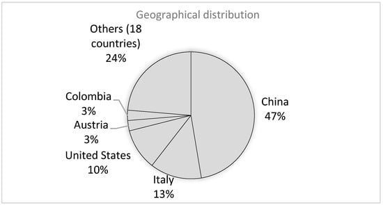 Based on our literature review, most of the contributions in the field of mountain logistics have been conducted in China, encompassing 47% of the research coverage. Italy follows with 13%, while the United States contributes 10%. Austria and Colombia collectively account for 6% of the research; the remaining 24% is distributed across 18 countries, see Figure 4.