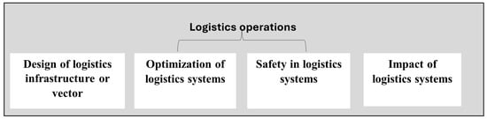 The literature review identified four main themes: design of logistics infrastructure or vector, optimization of logistics systems, safety in logistics systems, and impact of logistics systems (see, Figure 5). These themes covered a wide range of subtopics for a comprehensive exploration.