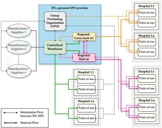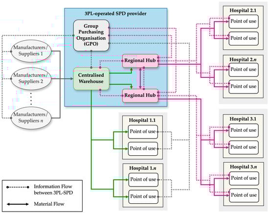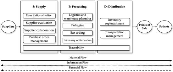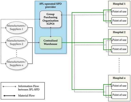 Recent research has explored the implementation of the SPD model in hospital supply chains. For instance, in China, integrating the SPD model with a supply-procurement platform and a lean logistics management system has enabled effective management of medical consumables within hospitals []. Additionally, there have been recommendations for optimising the logistics distribution network of the SPD model specifically for managing medical consumables in hospital environments [,,]. In Japan, Tokyo University Hospital has outsourced its material management activities, utilising the SPD model for daily procurement, receiving, stocking, and replenishment of medical supplies, serums, and pharmaceutical items []. These studies underscore the growing interest in and application of the SPD model in hospital supply chain management, aimed at enhancing the effectiveness of healthcare services delivery.