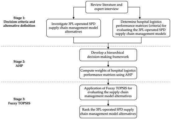 Consequently, this research developed a three-stage methodology integrating MCDM approaches into evaluated 3PL-operated SPD supply chain management models. In the first stage, feasible supply chain management models were identified, and relevant hospital logistics performance attributes were determined through a review of literature and interviews with hospital supply chain experts. In the second stage, AHP was applied to assign weights and prioritise sub-criteria and criteria for hospital logistics performance attributes. Finally, Fuzzy TOPSIS was used to evaluate the alternatives and determine the most optimal SPD supply chain management model for practical implementation in Thai hospitals.