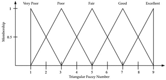 Step 1: Create a fuzzy decision matrix—A fuzzy decision matrix is developed by gathering linguistic variables from six experts. These experts express their preferences for each supply chain management model alternative using linguistic values outlined in Table 1. The linguistic values are subsequently converted into Triangular Fuzzy Numbers (TFN). Table 1 provides a list of the linguistic variables along with their corresponding TFNs, while Figure 4 illustrates the triangular membership function.