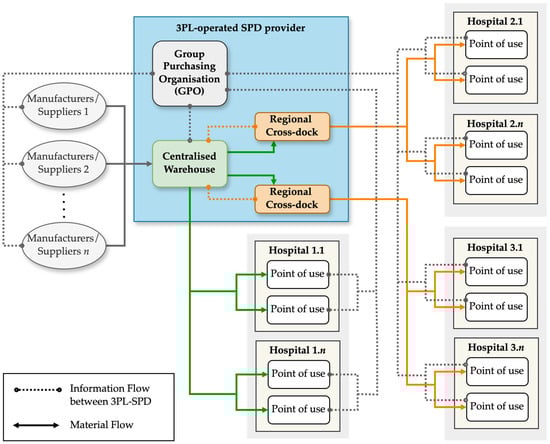 Similar to the initial model, the GPO unit continues to negotiate optimal procurement deals for all hospitals within the network. The centralised warehouse is responsible for overseeing the supply, processing, and distribution of medical consumables to nearby hospitals and regional cross-docks (represented by the green line). For more distant hospitals, this model introduces the clustering of hospital members by adding regional cross-docks into the network []. These cross-docks facilitate partial processing and distribution to more distant hospitals (represented by the orange line), serving as intermediary points that improve the distribution flow.