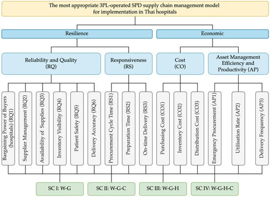 The subsequent step involved the identification and prioritisation of hospital logistics performance attributes for assessing and selecting the most suitable 3PL-operated SPD supply chain management model. This study focused on deriving decision criteria from two primary dimensions of performance critical to supply chain operations managements: resilience and economic efficiency [,]. AHP was applied in this step to determine the significance of these criteria, utilising input from experts and relevant stakeholders in hospital supply chains. Following this, a hierarchical decision-making framework was established, comprising the set of decision criteria and sub-criteria, along with the proposed alternatives for 3PL-operated SPD supply chain management models. Further details are provided in Section 5.