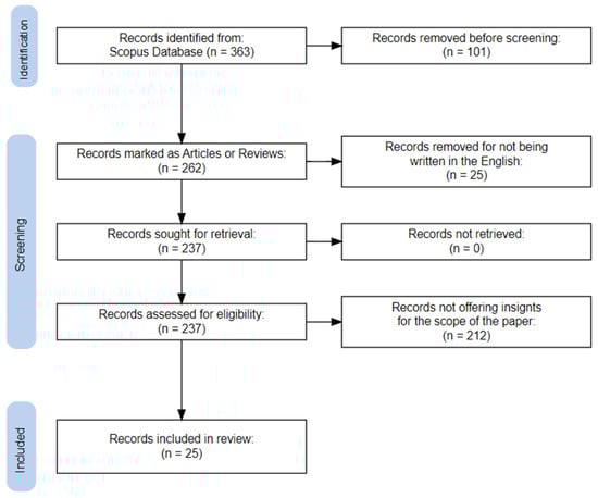 The selection of articles for consideration was made using the process shown in Figure 2, where the tool offered in an open-source package and a web-based app developed by [] were used. According to the aforementioned search terms, the initial number of results from the Scopus database was 363, of which 101 were removed due to duplication. Subsequently, out of the 262 results, 25 were excluded due to the use of a non-English language. Of the 237 articles retrieved for review, 212 did not directly contribute to the paper’s research questions and were therefore excluded. Finally, 25 articles were included in the research process.