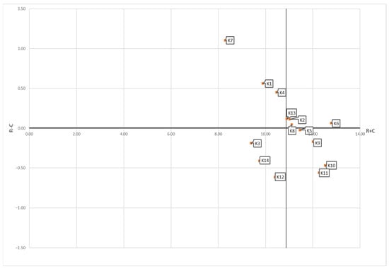There are seven CFs that are classified as effects (with R − C < 0): K5 > K9 > K3 > K14 > K10 > K11 > K12. ‘Cost structure’ (K12), and ‘Specialized professionals’ (K11) are the factors that are most influenced by other factors and by the results of the decision-making.
