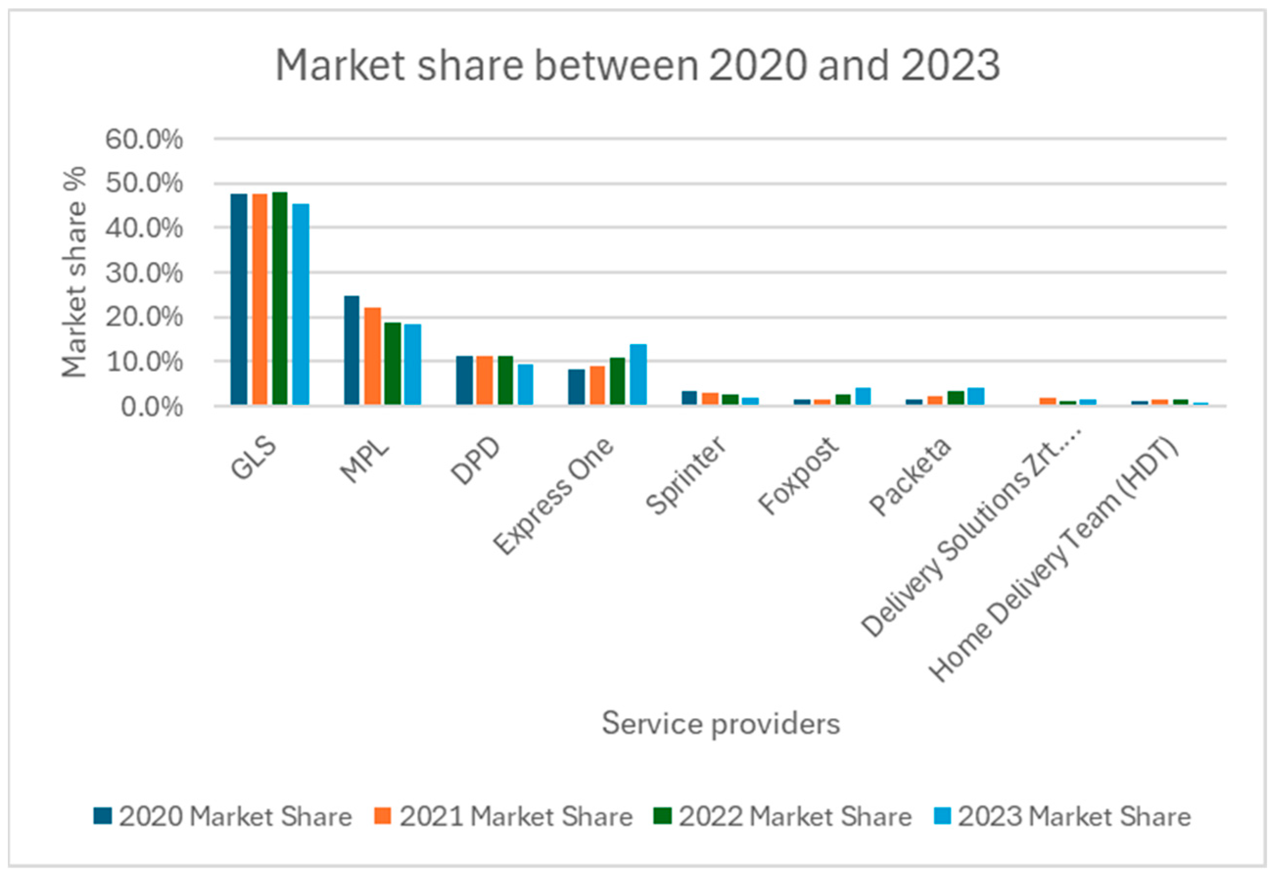 Since 2019, GLS has held the leading market position, followed by Magyar Posta, DPD, and Express One.