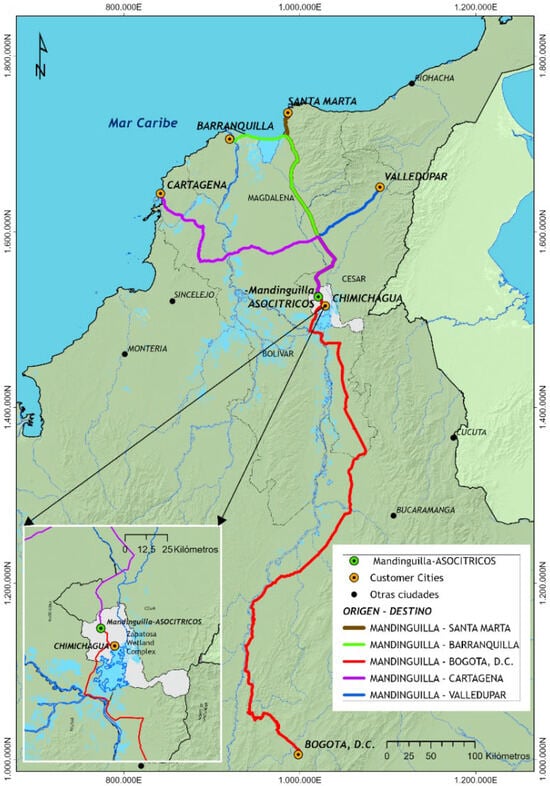 Geographical layout of the citrus fruit supply chain in northern Colombia, supplying markets in Barranquilla, Bogotá, Cartagena, Santa Marta, and Valledupar.