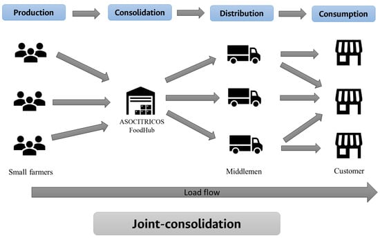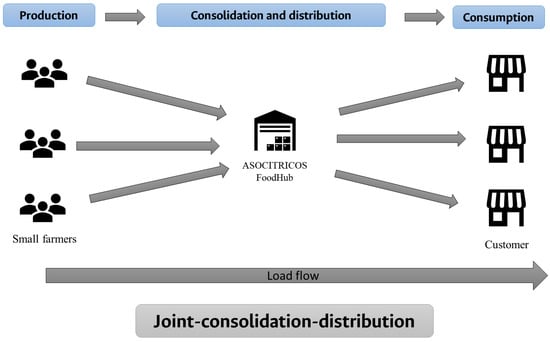 Overview of the joint-consolidation–distribution scenario. Farmers and ASOCITRICOS jointly consolidate harvests at the food hub for direct distribution to customers, eliminating middlemen. ASOCITRICOS sets prices, markets the harvest, and manages centralized logistics, assuming delivery liability.