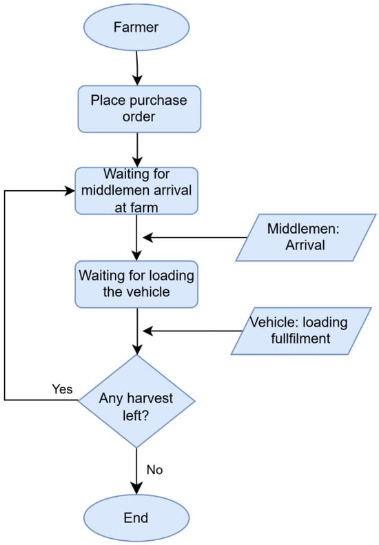 Figure 5 depicts the state chart of the farmer agent in the base scenario. Ater initialization, the farmer places a purchase order with the middleman for the harvest. The farmer then waits for the arrival of the middleman at the farm gate. Once the middleman arrives, the loading process begins. When the vehicle becomes full, the farmer waits for the middleman to return if there is still harvest remaining at the farm. Otherwise, once the harvest is fully delivered, the farmer transitions to an inactive state and no longer participates in the system’s operations for the remainder of the simulation.