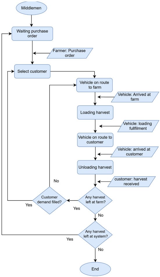 Similarly, Figure 6 depicts the state chart of the middleman in the base scenario. Each vehicle agent is assigned to a specific middleman at initialization, stablishing a one-to-one correspondence in which vehicles effectively represent middlemen. The middleman waits for purchase order from farmer. Upon receiving a purchase order, the middleman selects a customer and proceeds to the corresponding farm. Once they arrive at the farm gate, the loading process begins and continues until the vehicle reaches full capacity. The middleman then delivers the harvest to the customer. If there is still harvest left at the farm, the middleman returns to the farm to collect additional harvest or select another customer, if the customer’s demand is fully satisfied. If an uncollected harvest still exists in the system, the middleman continues waiting for purchase orders from farmers. Otherwise, middleman transitions to an inactive state and ceases participation in the system’s operations for the remainder of the simulation.