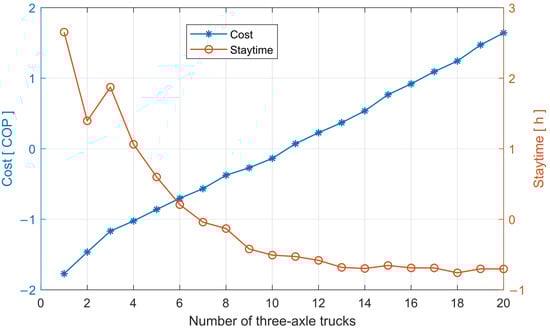 Normalized Staytime and total logistics costs (Cost) as functions of the number of three-axle trucks. COP: Colombian Peso.