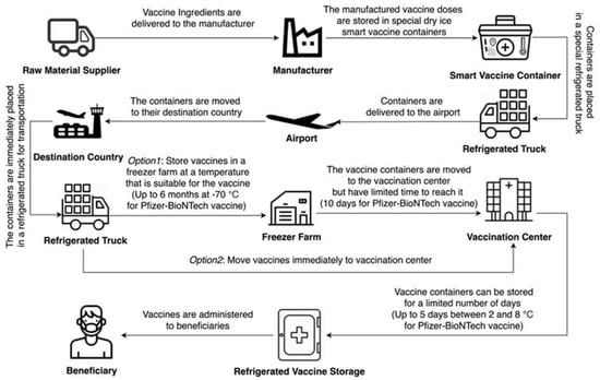 The proposed model has been applied in this paper to the case of the COVID-19 vaccine supply chain, which faced unique challenges due to its reliance on an extensive cold chain system to preserve vaccine integrity and efficacy. Governments procured vaccines directly from manufacturers, bypassing traditional wholesalers, necessitating the rapid establishment of new distribution channels. The logistics involved managing vast quantities of doses that required swift delivery under strict storage conditions, such as ultra-low temperatures (−90 °C to −60 °C) for vaccines like Pfizer–BioNTech’s Comirnaty. This cold chain was maintained using refrigerated trucks, ultracold freezers at distribution hubs, and specialised logistics infrastructure.