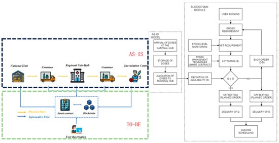 In the AS-IS model, the National Hub (NH) distributes vaccine doses to Regional Hubs (RHs) based on both dose availability and population characteristics, such as the number of healthcare personnel and elderly individuals [54,55,56,57,58]. This initial allocation enters the blockchain (BC) module (represented as the TO-BE section in Figure 3), where it is adjusted according to the daily stock levels at each RH and the selected inventory policy. The information flow is updated using BC technology and smart contracts, enabling real-time stock monitoring at RHs and determining lot sizes based on citizen requests (final demand).