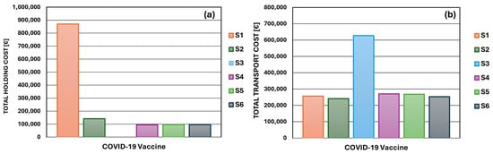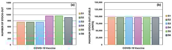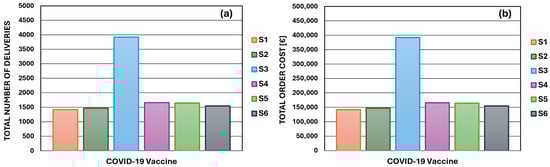 Figure 8 presents the total holding cost (HC, Figure 8a) and the total transportation cost (TC, Figure 8b). In terms of total holding cost, blockchain (BC) technology provides significant advantages by enabling inventory management that closely aligns with real demand and current stock levels. This approach facilitates stock minimisation, thereby reducing holding costs. This is particularly crucial for COVID-19 vaccines, which are highly sensitive to temperature and require specialised storage conditions, including ultra-low-temperature freezers, which are costly. Maintaining the minimum necessary stock significantly reduces supply chain risks. Notably, the lot-for-lot method (S3) incurs no holding costs, as it supplies the exact quantity required each day. As expected, cost optimisation techniques such as the Silver–Meal (S4) and Least Unit Cost (S5) approaches result in lower holding costs compared to the AS-IS model (S1) and the fixed-period method (S2). However, it is important to emphasise that these techniques focus on cost minimisation over specific periods rather than the entire simulation period, meaning their long-term performance is not always guaranteed. The Part-Period Balancing method (S6), designed to balance ordering and holding costs, proves to be the most effective policy when focusing specifically on minimising holding costs. Regarding transportation costs, the lot-for-lot method (S3) incurs the highest expenses, as it necessitates daily deliveries based solely on immediate demand, without optimising for cost efficiency. In contrast, the other techniques reduce transportation costs by decreasing delivery frequency, consolidating orders, and optimising shipments to ensure full-load deliveries.
